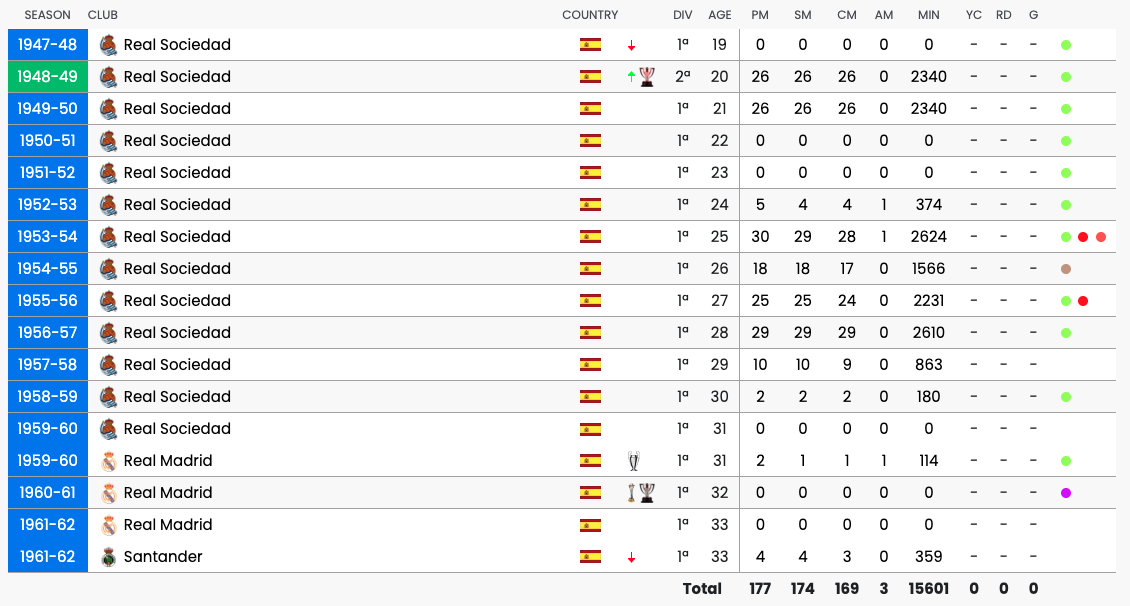 During his time between the posts for Sociedad in the top division, they recorded finishes of 8th (1949/50), 10th (52/53), 9th (53/54), 14th (54/55), 8th (55/56), 12th (56/57), 9th (57/58) and 10th (58/59); and for the last three seasons, he was captain.